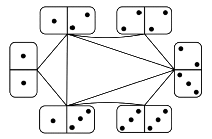 Anna egy lapra elhelyezte dominókészletének azt a hat dominóját, amelyek mindkét részén van legalább 1, de legfeljebb 3 pötty. Ezután összekötötte azokat a dominókat, amelyeket a játékban csatlakoztatni lehetne egymáshoz. Az alábbi ábra a hat dominót és az összekötő vonalakat mutatja, de csak két részen adtuk meg a pöttyöket.